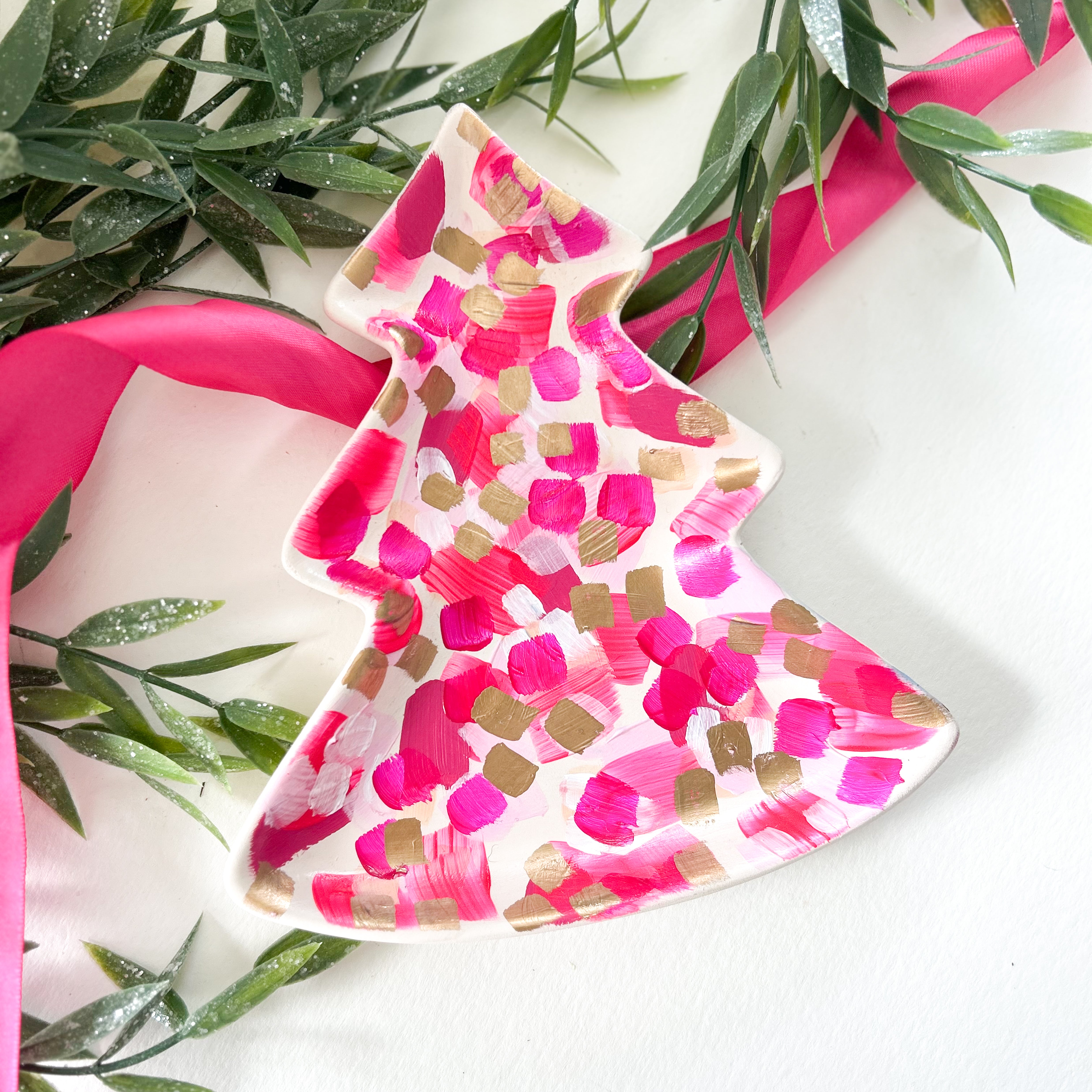 The pink abstract Christmas tray design is inspired by the celebrations that kick off the southern Christmas in South Carolina. Ceramic tray is hand painted and sealed for hand washing and dining.