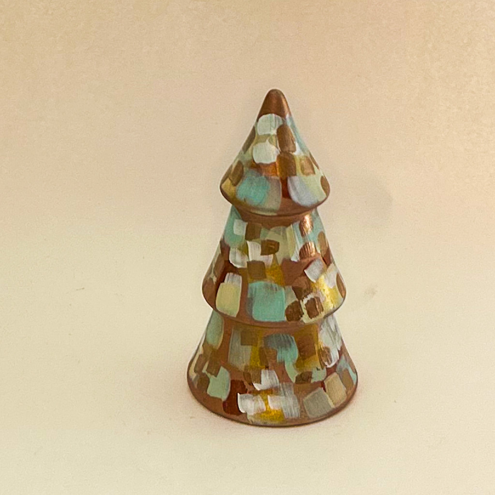 The Copper Mini Tree is hand painted by Jessica Reynolds on a ceramic tree measuring at 6 inches tall with an abstract design in bright colors and gold leaf.