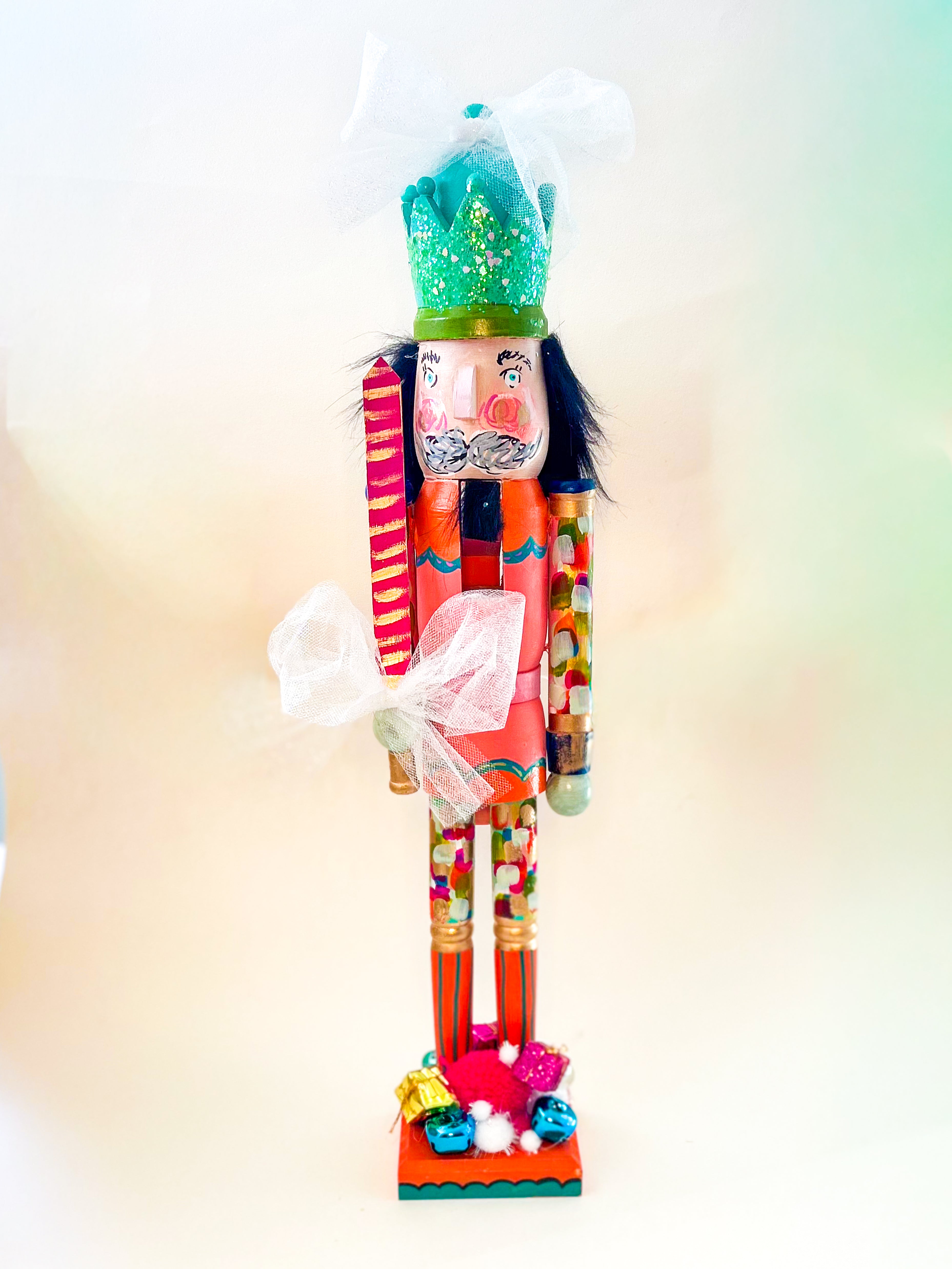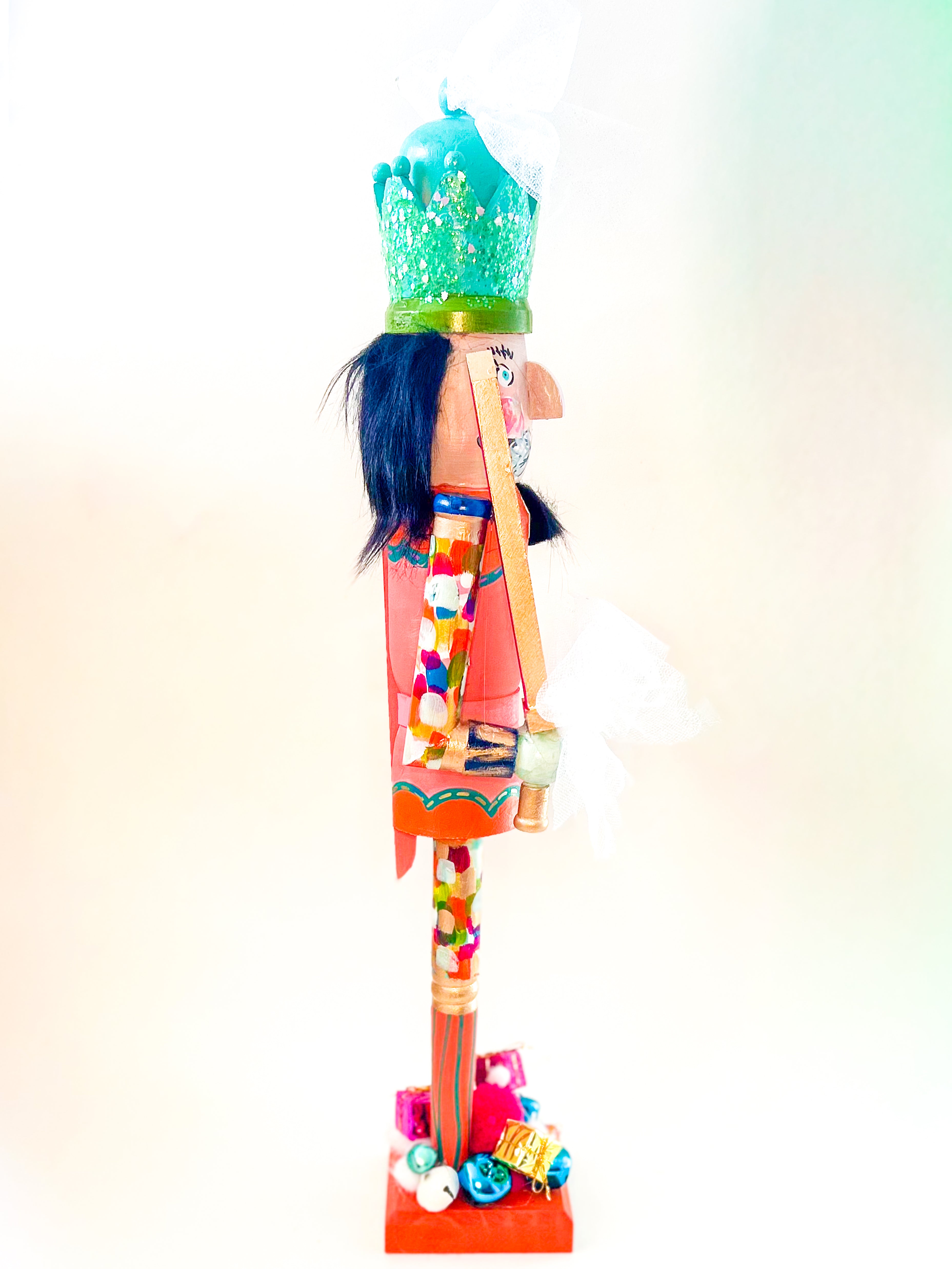 Fancy Party Large Wooden nutcrackers hand painted by Jessica Reynolds and include gold embellishments.  Nutcracker  is 24 inches tall.