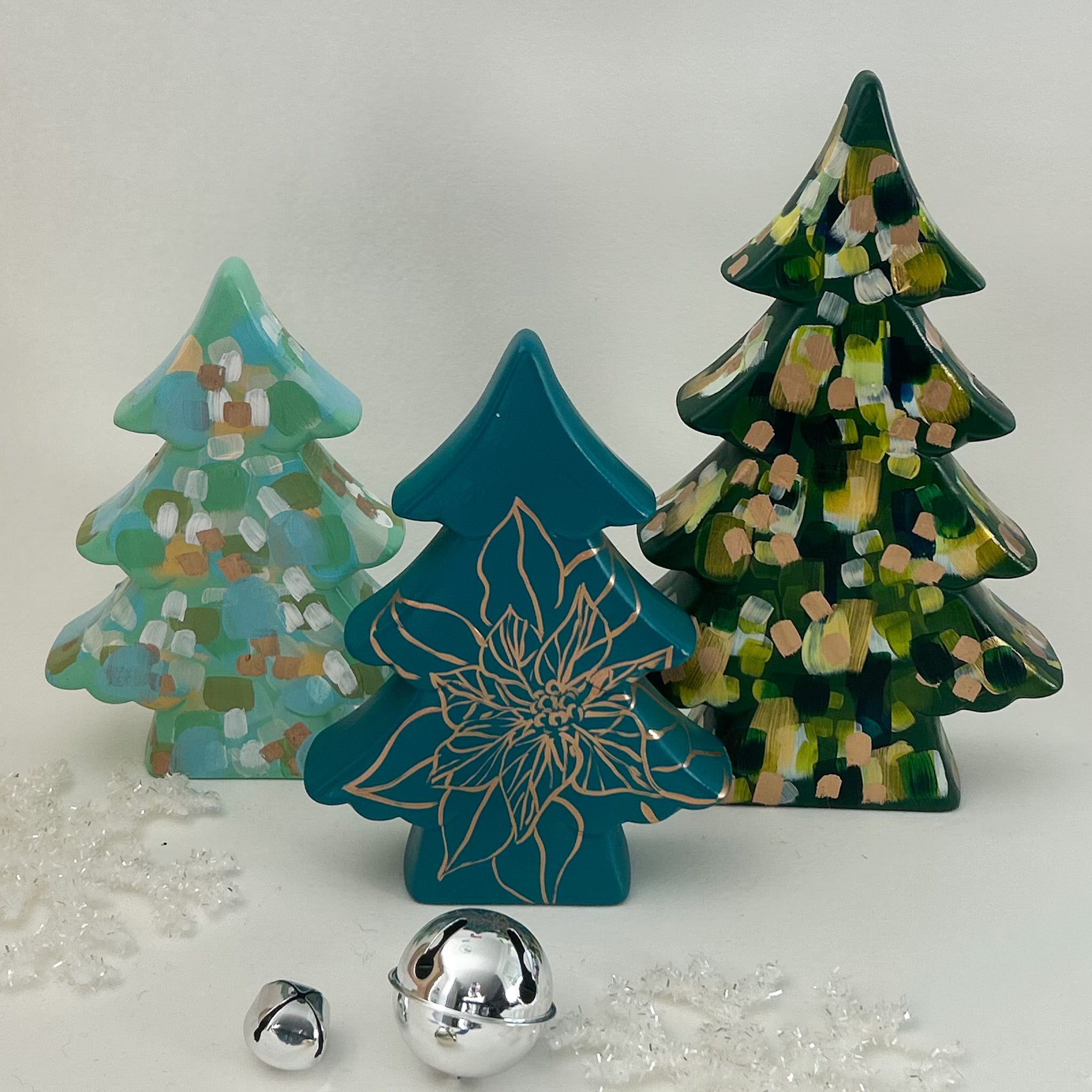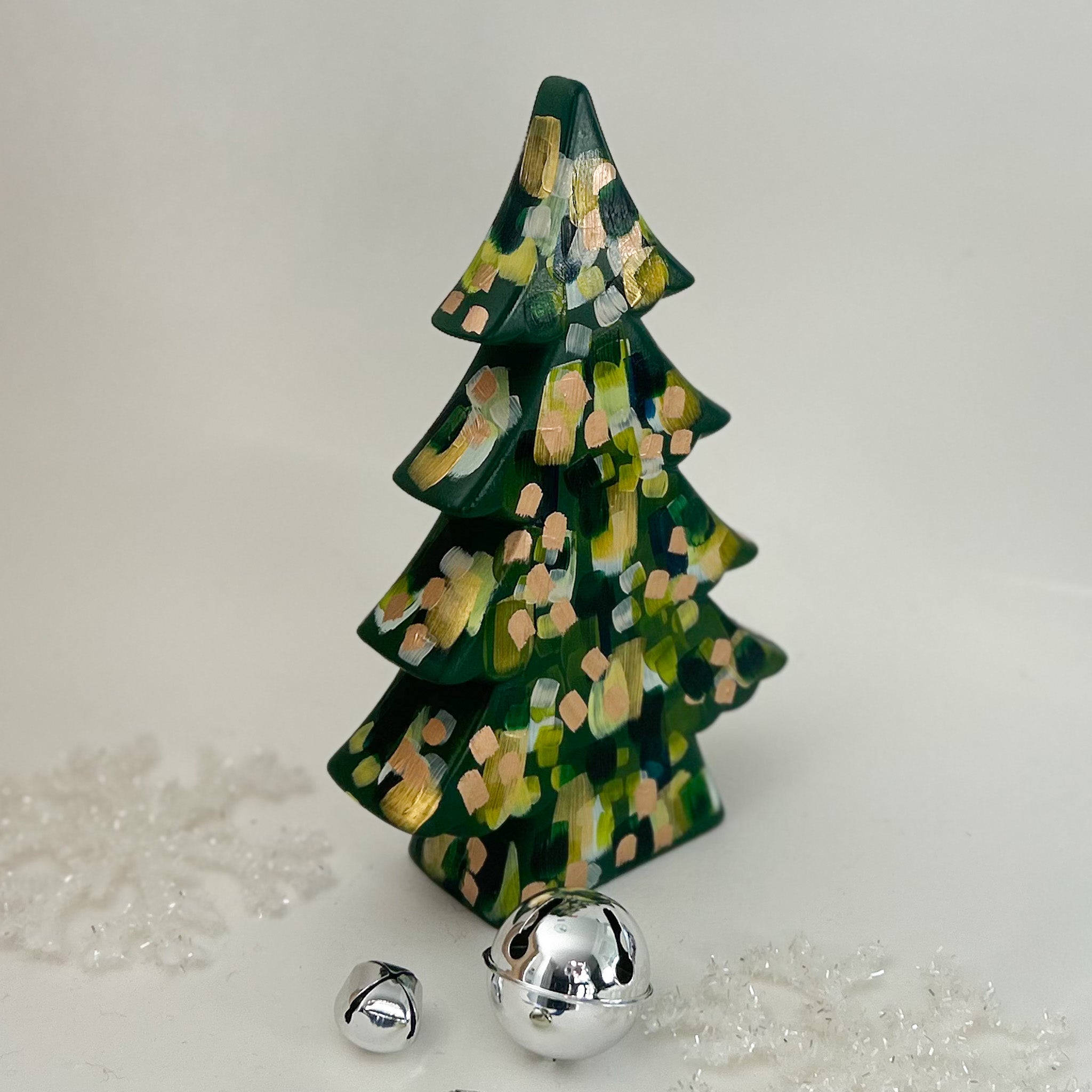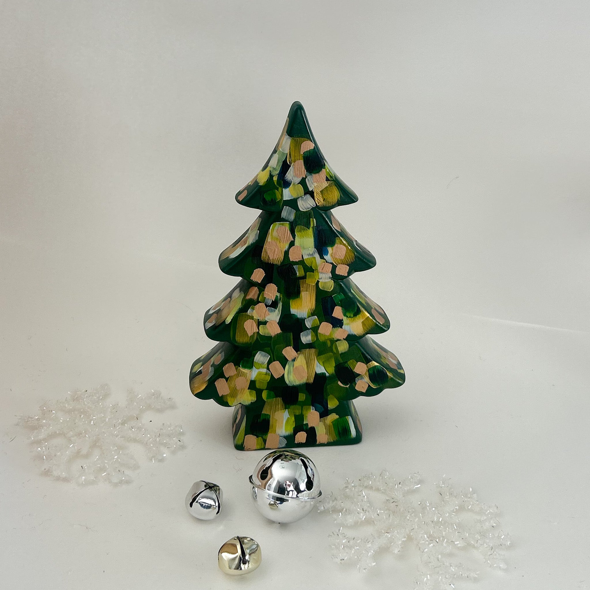 The Large Green Abstract Shelf Christmas Tree is hand painted by Jessica Reynolds on a ceramic tree measuring at