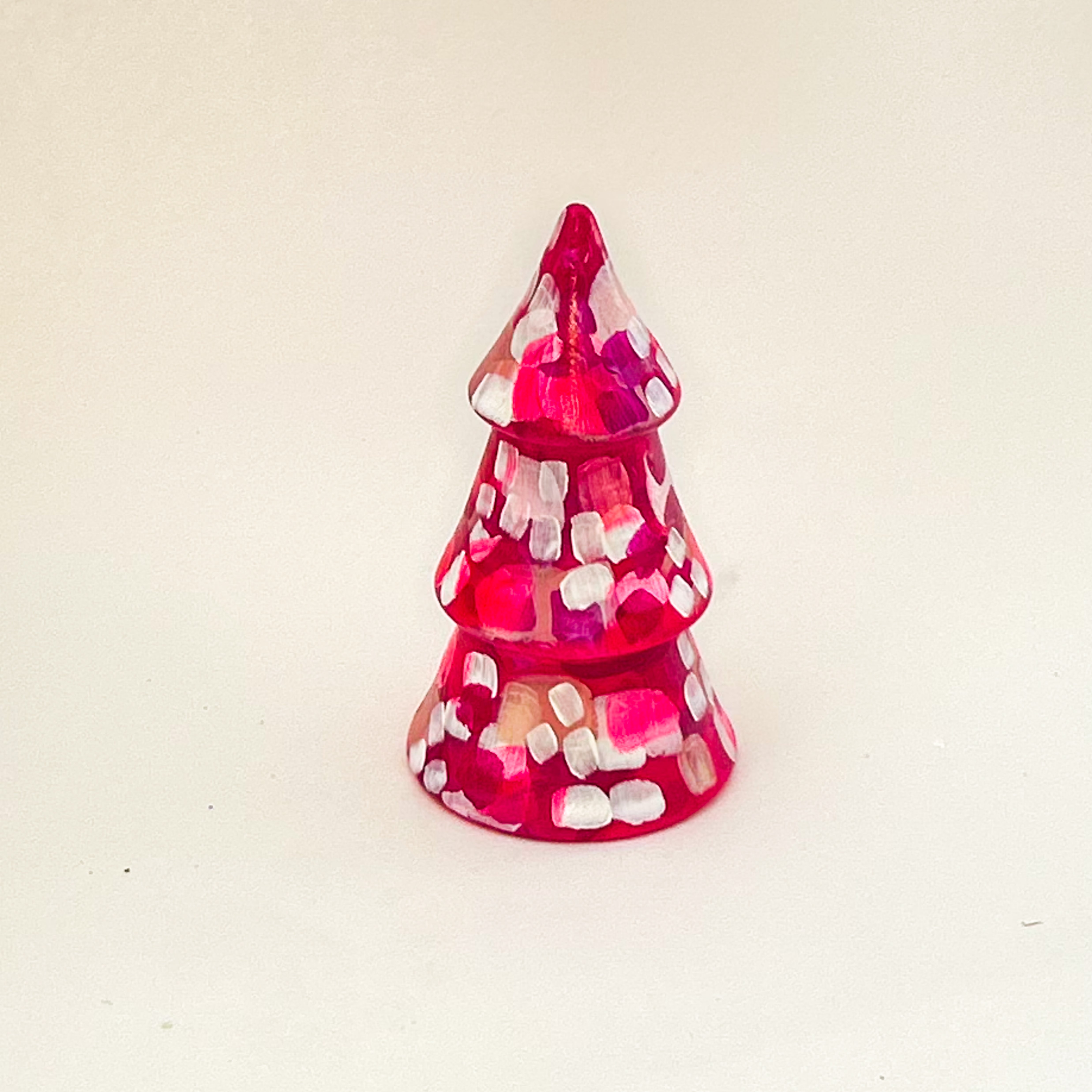 The Neon Pink Mini Tree is hand painted by Jessica Reynolds on a ceramic tree measuring at 6 inches tall with an abstract design in bright colors and gold leaf.