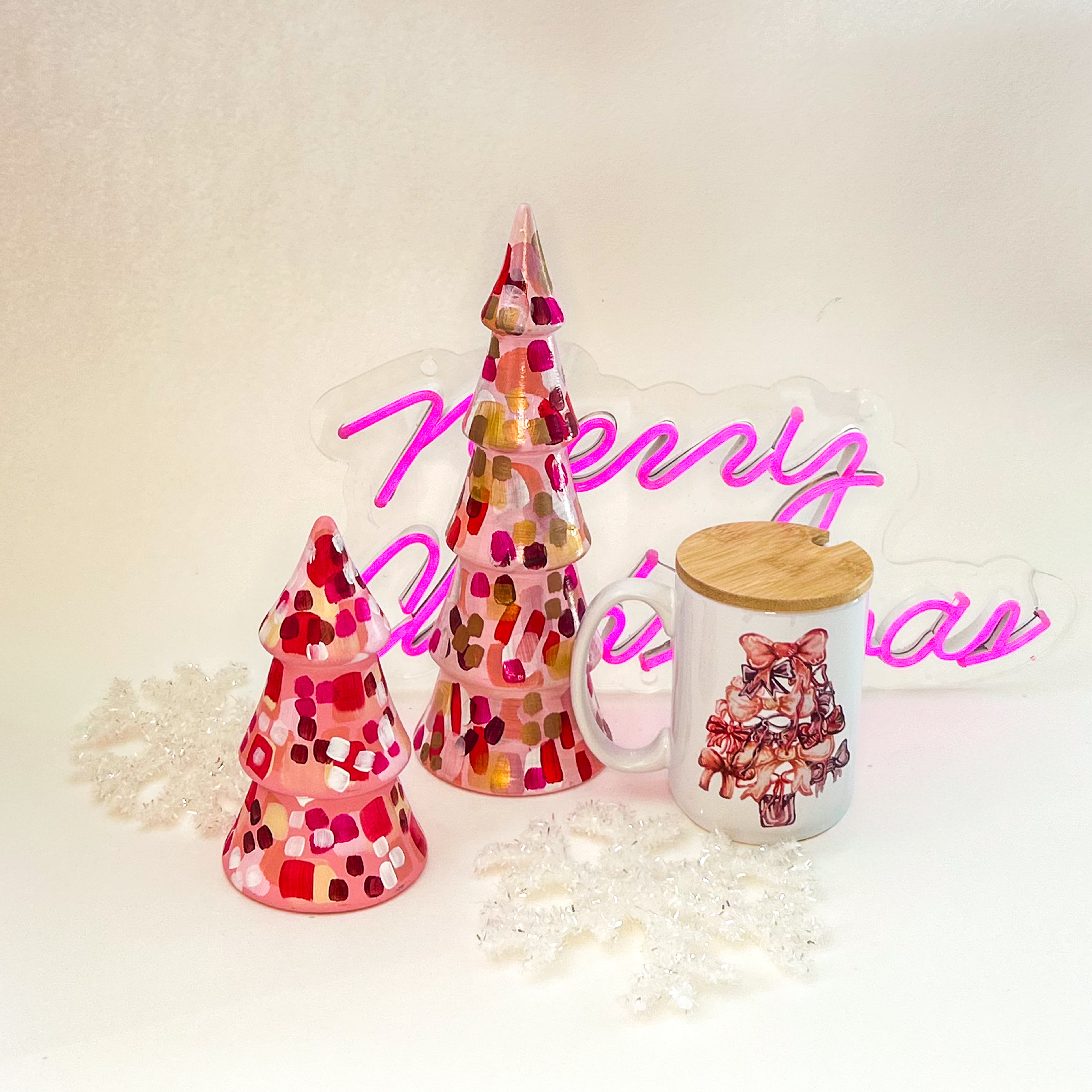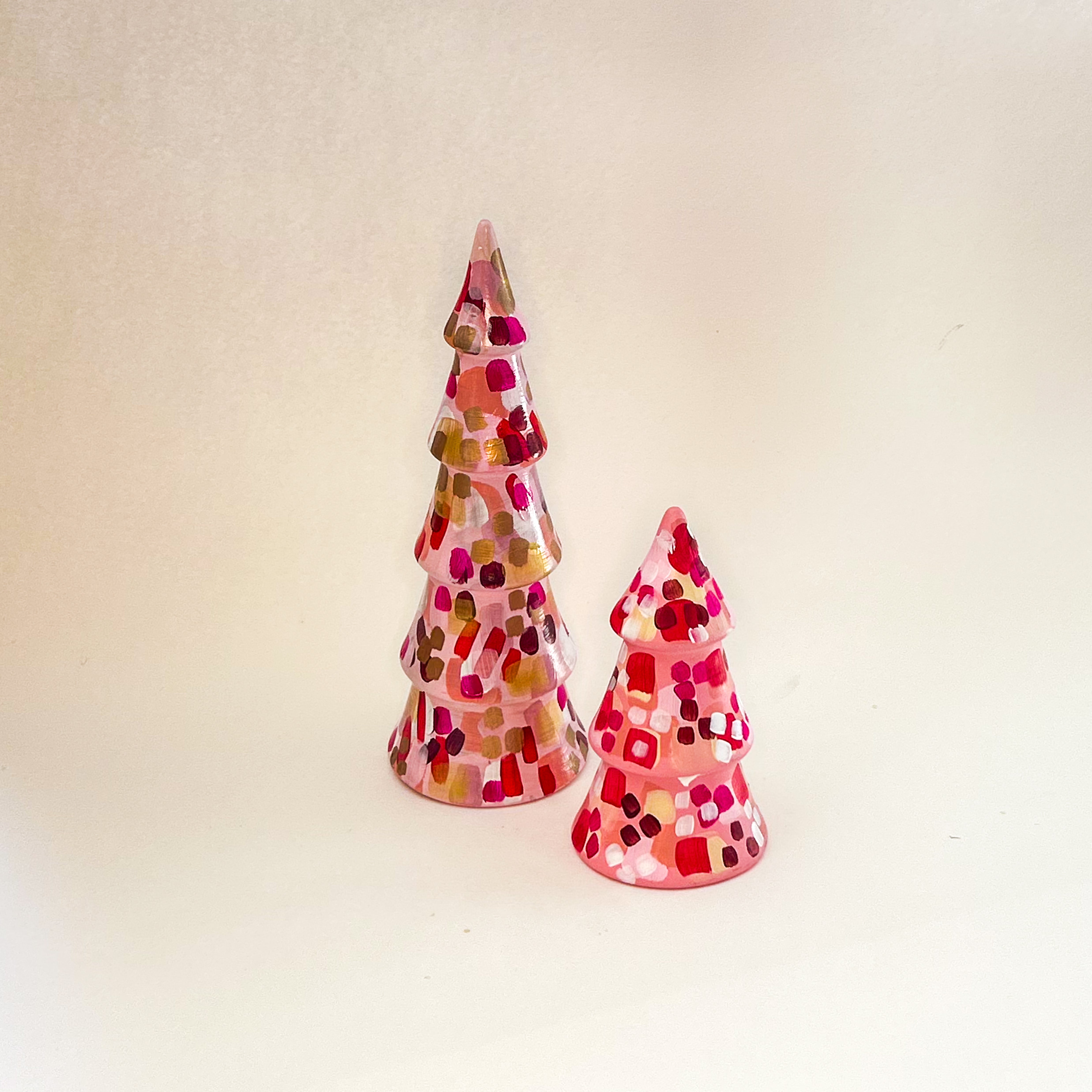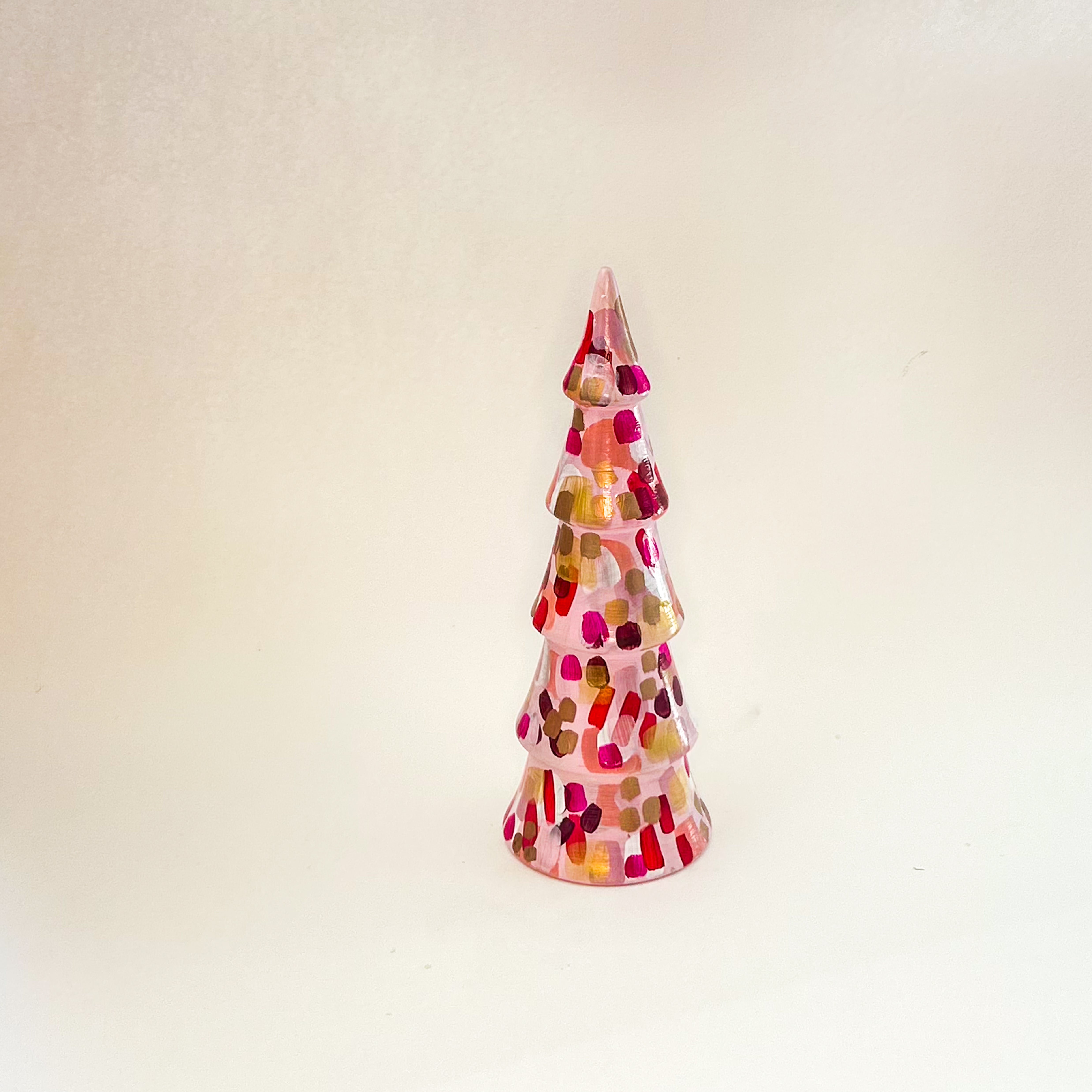 The Pink and Red Tall Tree is hand painted by Jessica Reynolds on a ceramic tree measuring at 10 inches tall with an abstract design in bright colors and gold leaf.