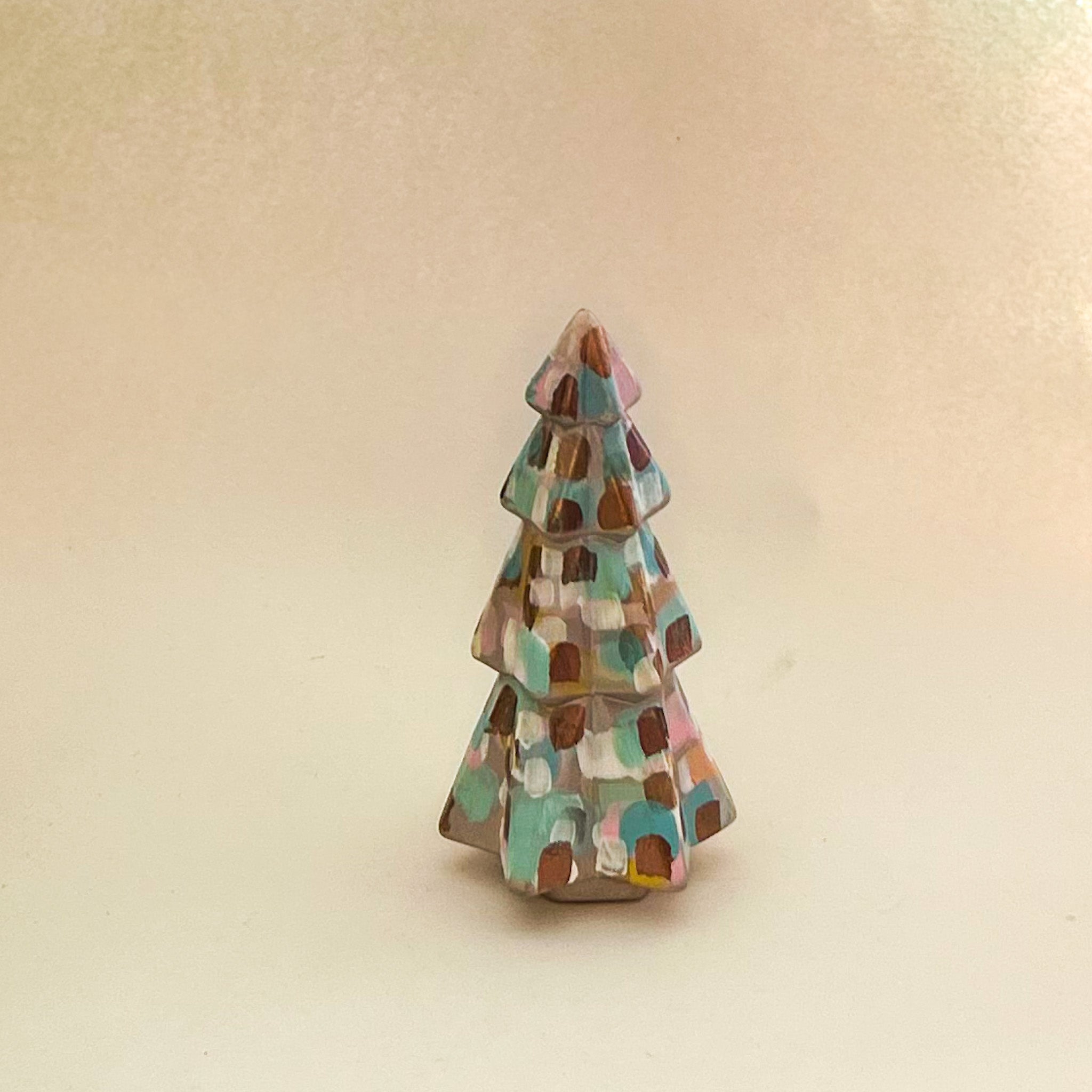 The Small Metallics and Pastel Tree is hand painted by Jessica Reynolds on a ceramic tree measuring at 7 inches tall. The tree is embellished with gold leaf and bright colors.